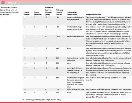 Characteristics, interventions and long-term outcome in patients with biliary strictures are described in Table 3 . In summary, six of these patients eventually underwent re-HJ, one patient underwent a left hepatectomy and one developed secondary biliary cirrhosis requiring orthotopic liver transplantation. The remaining two patients each underwent one percutaneous balloon dilatation and have remained event-free ever since (Table 3).