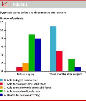 Prior to surgery, 17 of the 20 patients (85%) suffered from severe swallowing problems (Figure 3). The eight patients who were rated with a dysphagia score of four prior to surgery were unable even to swallow their saliva.
