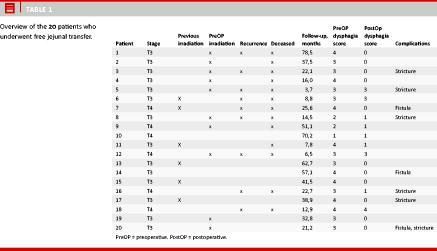 Material and methods: Material and methods: Twenty patients aged 46-75 years were included. In all 20 cases, the diagnosis was squamous cell carcinoma, T3 or T4. All patients suffered from severe dysphagia prior to surgery. The median follow-up time was 23 months at 31 January 2010.