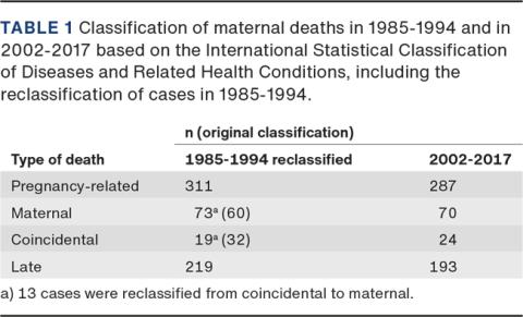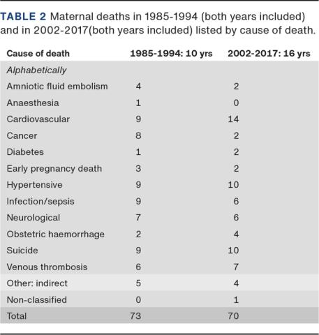 METHODS. Maternal deaths were identified from 1985 to 1994 and from 2002 to 2017 by linking four national health registers, death certificates and notifications from maternity wards. A group of obstetricians categorised and assessed all medical records, classifying each case by cause of death.