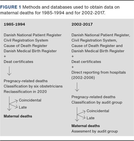 For two periods, 1985-1994 and 2002-2017, deaths during pregnancy and up to one year after pregnancy were identified by register linkage, whereby late deaths were included in the dataset (Figure 1).