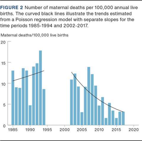 To determine whether there was a trend over time in the MMR, the number of annual deaths was analysed in a Poisson regression model using the number of births per year as an offset variable. Calendar year (quantitative) and period (categorical) were used as explanatory variables. A test of interaction between the two variables was performed to assess whether the trend in MMR in the two periods differed. From the interaction model, the annual change in MMR was estimated and the model was further used to estimate the annual number of deaths per 100,000 births. The significance level was set to 0.05. The analyses were performed using R version 4.0.2.