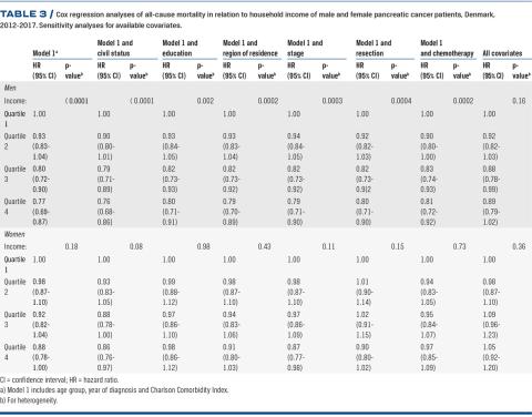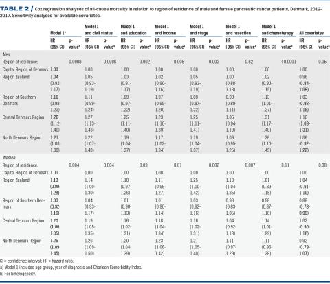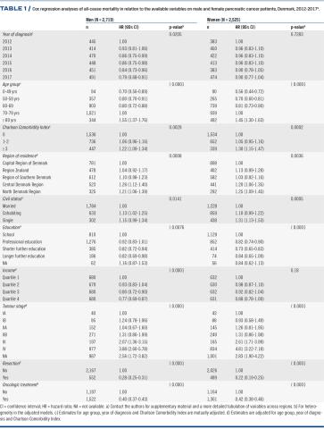 Methods: We included a total of 5,244 pancreatic cancer patients (WHO International Classification of Diseases, tenth version C25) registered in the Danish Pancreatic Cancer Database during 2012-2017. The data sources used were the Danish Civil Registration System, the Danish National Patient Registry and the Danish national registers on education and income at Statistics Denmark. Cox regression analysis was used to examine all-cause mortality of pancreatic cancer patients by region of residence and socio-economic status.