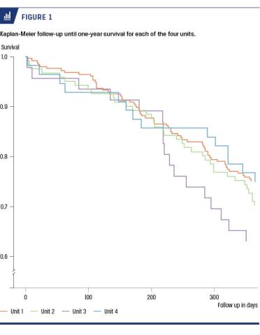 Readmissions within 30 days from discharge occurred a total of 122 times (26.4%) and with some variation between the units (range: 23.1 - 31.8%).