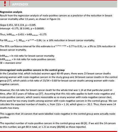 Comprehensive systematic reviews have suggested that mammography screening reduces breast cancer mortality by 15-16% [1, 2]. This estimate is of the same size as the bias in the regression analysis of node-positive cancers.