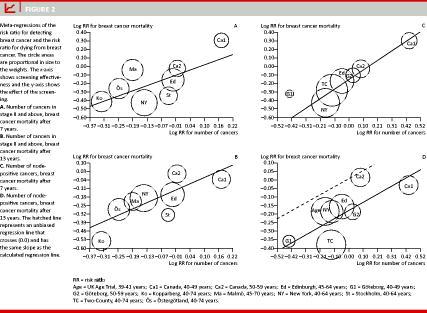 One would also expect trials that were more effective in identifying cancers before they had metastasised to yield larger effects [3]. An indication that this may be the case was provided in a Letter to the Editor in The Lancet [4]. The authors found an association between the risk ratio for detecting node-positive cancers and the risk ratio for breast cancer mortality [4], but they included only women in the age-group 40-49 years and did not describe their methods.