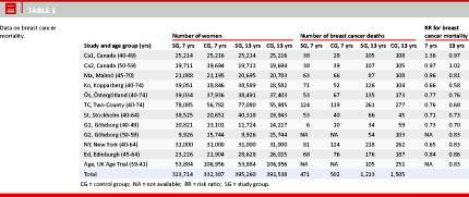The randomised mammography screening trials have shown varying results. After 13 years of follow-up, the results range from a 42% decrease to a 2% increase in breast cancer mortality [1]. Debates about how these differences are best explained have mainly focused on trial quality, as some trials appear to be more reliable than others [1-3]. The most straightforward explanation – differences in screening effectiveness – has received little attention. Screening effectiveness can be perceived as the ability to advance the time of diagnosis, which leads to identification of more cancers than in an unscreened control group [3]. A screening programme that finds many cancers, e.g. owing to a high sensitivity, should therefore lead to a larger reduction in breast cancer mortality relative to a control group than a programme that identifies fewer cancers.