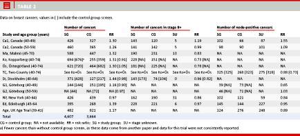 Many values were missing. The number of node-positive cases was only twice that of cases with unknown nodal status (Table 2). Node-negative cancers are not relevant, as many of these are overdiagnosed. Metastatic disease is considered the best proxy for breast cancer mortality, but more women with positive nodes failed to be identified in the control group than in the study group, as control group women were more likely to be treated in centres where careful nodal dissection was not the norm. This problem has been acknowledged for the Two-County and Canadian trials [35, 36] and is supported by the finding that in the Canadian trial covering women in the age group 40-49 years, 47% of those who died of breast cancer in the control group had node-negative cancer compared with only 28% in the mammography group [1, 37].