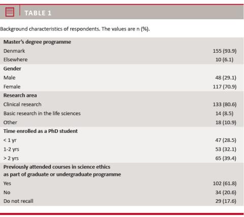 presents the characteristics of the respondents, the majority holding a master's degree from Denmark, being female and doing clinical research. Length of enrolment shows an equal division between first-, second-, and third-year PhD students. This is in line with current enrolment. Likewise, the gender split of the data does not give rise to specific concerns (63% of the PhD students enrolled at the Faculty of Health Sciences are female [13]).