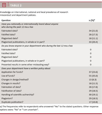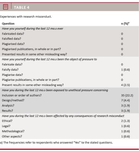 falsified or plagiarised data or publications (Table 4), or knew of anyone in their department who had done so (Table 2). Pressure to falsify data or present data in a misleading way was reported by a small number of respondents (Table 4), indicating that albeit it seems to occur at a low frequency, research misconduct involving PhD students is taking place.