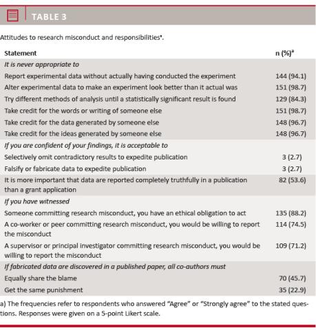 Most were aware of their ethical obligation to act on research misconduct actions of others, but showed limited willingness to actually take action if a co-worker or supervisor commits research misconduct (Table 3). This may be explained by the unequal power relationship between the PhD student and his or her supervisor, which may keep some from such an overt act as reporting. Furthermore, misconduct may involve the PhD student personally, for instance through co-authoring of a flawed publication.
