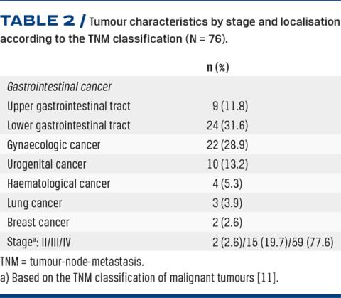 A total of 367 cancer patients underwent acute exploratory laparotomy during the 2009-2013 period. Overall, 76 patients met the inclusion criteria. Of 76 included patients, 62% were men, 80.3% were older than 60 years and 50% had one or more co-morbidities. Hypertension was the most frequently observed co-morbidity (26% of the patients), 53.9% of patients had an ASA score < III and 82.8% had a performance status < 3. A summary of demographic information is found in Table 1.