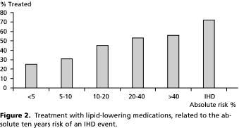 Conclusions: Subjects monitored for dyslipidemia were relevantly monitored because of IHD or high risk of IHD, and initiated treatment of dyslipidemia was clearly related to the individual assessed risk of IHD. Only a minority reached the treatment goals (< 5 mmol/l), and the statin doses used were generally lower than the doses used in clinical trials.