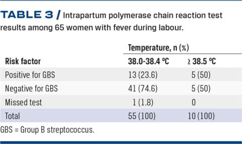 Fever during labour occurred in 2.3% of the labouring women in the present study, which is in accordance with the 3.3% seen in earlier studies [2]. Romero et al found GBS in cultures from amniotic fluid in 19% of women with clinical chorioamnionitis at term (defined as a maternal temperature of 37.8 °C or higher and at least two of the following criteria: uterine tenderness, malodorous vaginal discharge, foetal or maternal tachycardia or maternal leukocytosis) [15]. Our findings suggest an almost similar prevalence of chorioamnionitis with GBS (22%) defined by a high maternal temperature and the positive results of a GBS PCR assay on rectovaginal swabs.