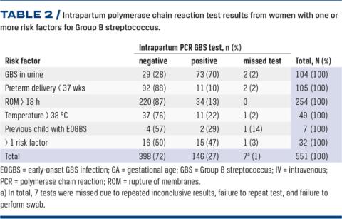 The distribution of risk factors is shown in Table 2. The PCR test for GBS was positive in 27% (146/551) of all cases with one or more risk factors for EOGBS; however, among women with GBS bacteriuria during their current pregnancy, 70% were positive versus only 13% among women with ROM for more than 18 hours (Table 2). Overall, 5.1% (146/2889) had both risk factors for EOGBS and a positive intrapartum GBS PCR test.