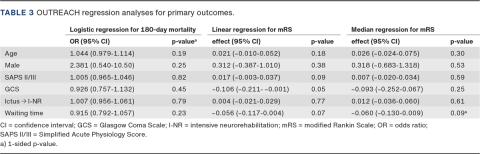 The primary outcomes were analysed using regression analyses. For 180-day mortality, a logistic regression was applied. For mRS, a linear regression (assuming normal distribution) was applied along with a nonparametric median regression without this assumption. As covariates, the following were included: age, gender, SAPS II/III, GCS, time from ictus to INR and waiting time.
