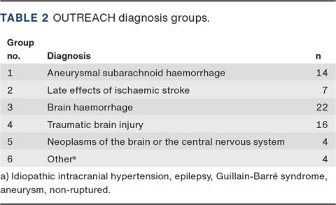 INTRODUCTION Brain injury from haemorrhage, trauma, aneurysm and stroke is characterised by high mortality and impaired neurological outcome. In the OUTREACH study, the authors wanted to assess patient care from admission to intensive neuro rehabilitation to discharge. We hypothesised that early rehabilitation was beneficial to neurological outcome.