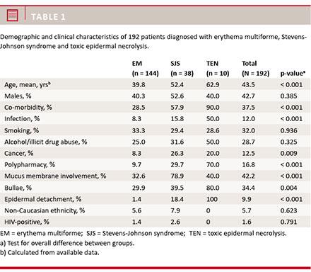 Results: In a total of 192 cases (77.4%), the primary diagnosis of EM (66.5%), SJS (62.2%) and TEN (100%) was confirmed, whereas the remaining cases (22.6%) were diagnosed differently. Antibiotics and allopurinol were predominantly associated with TEN, whereas SJS was associated with a broad spectrum of drugs. EM was related mainly to viral infections, predominantly herpes (30.6%); 38.2% of the causes of EM remained unknown. Patients with TEN had the highest mortality; i.e. 60% in the course of the ten-year study period: adjusted hazard ratio (HR) = 11.2 (95% confidence interval (CI): 3.65-34.35); p < 0.001 compared with EM patients. The risk of death was also increased among patients with SJS relative to patients with EM: HR = 2.60 (95% CI: 1.10-6.16); p = 0.030; however, this did not remain statistically significant after adjustment for age, co-morbidity, infection, cancer and polypharmacy, HR = 0.99 (95% CI: 0.38-2.57); p = 0.976.