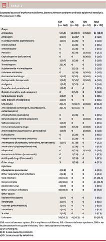Retrospective validation of hospital records showed that around one fourth of all patients diagnosed with TEN, SJS and EM were later deemed to have been misclassified. Known and suspected causative drugs were found to be related to TEN and SJS, whereas EM was shown to be predominantly associated with infections such as