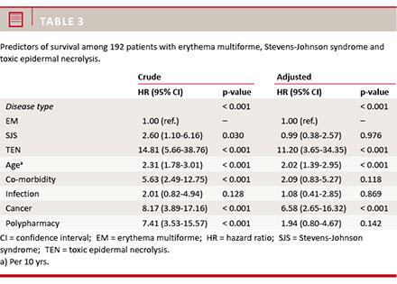 The survival of patients with SJS, but particularly with TEN, was expectedly low compared with that of patients with EM. We extend previous findings by showing that after adjustment for age, co-morbidities, polypharmacy and cancer, the survival rates of SJS and EM were comparable.
