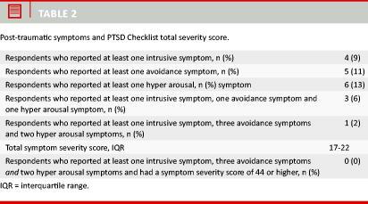 Table 2 shows the number of respondent who reported symptomatic in PTSD symptoms and gives the interquartile range (Q25%-Q75%) of the PCL total symptom severity score.