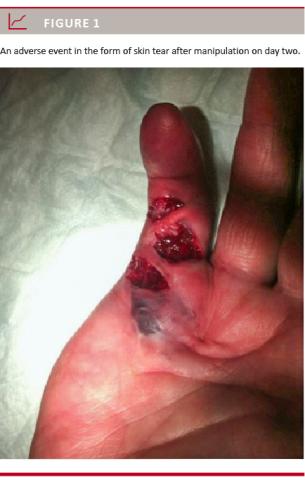 This finding can be used to inform patients considering collagenase treatment. Patients with severe contractures could consider other treatment modalities. We found no post procedure infections among patients with skin tears. Although a skin tear could be perceived as a coarse AE to the patient, it is our opinion that it is but a minor AE with minor long-term risks. Our results showed a higher number of skin tears compared with previous studies [11]. An explanation could be that our manual manipulation technique is less considerate than that of other physicians. However, none of the previous studies at hand were comparable as they describe DD in the thumb or treatment of more than one cord [7].