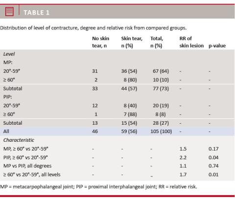 Conclusions: There is a significantly higher relative risk of skin tear when the contracture is ≥ 60° and when the contracture is ≥ 60° and located at the PIP joint. The most important factor regarding the risk of skin tear is the degree of the contracture.