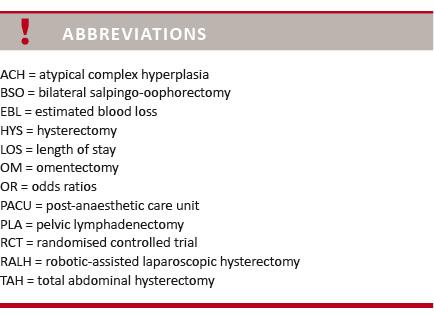 duration of surgery (skin-to-skin time), duration of anaesthesia, and duration of stay in the post-anaesthetic care unit (PACU). The inclusion criteria were: women diagnosed with endometrial cancer or ACH treated with HYS by TAH (1 March 2006-1 March 2009) or by RALH