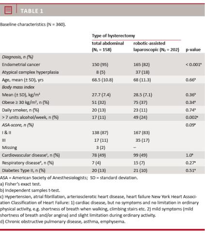 We included 360 women, 158 had TAH and 202 had RALH. Age, BMI, smoking, ASA score and comorbidity did not differ between the groups (Table 1).