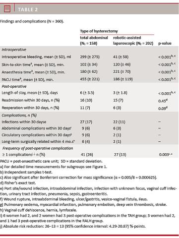 Results: RALH had significant advantages compared with TAH: fewer and less severe post-operative complications and a shorter length of hospital stay. The absolute risk reduction for post-operative complications was 13% (95% confidence interval: 4.29-20.87%). Women treated with TAH had significantly more severe complications (grade ≥ 3) than those treated with RALH; 12% versus 3% (p = 0.001). Infections (urinary and port site) were the most frequent post-operative complications overall. The duration of RALH in the operation theatre was longer, while the duration of stay in the post-anaesthesia care unit was shorter for patients undergoing RALH.