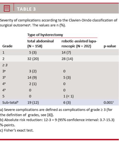 It has been questioned if the increased costs are justified by superior surgical outcomes. The aim of the present study was to examine the frequency, types and severity of post-operative complications after total abdominal hysterectomy (TAH) and RALH using the Clavien-Dindo classification of surgical outcomes.