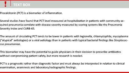 In patients with CAP, PCT has been most extensively studied with regard to its prognostic value and correl-ation with disease severity. This review shows that complications during admission, severity of disease measured with various scales (mostly PSI, CRB-65 and CURB-65) and, to a lesser extent, death within a month all tend to correlate with higher PCT levels – especially > 0.50 ng/ml. However, no definite cut-off has been found, and PCT should always be interpreted carefully and compared with the results of the clinical examin-ation. PCT should furthermore be regarded a prognostic rather than diagnostic factor.