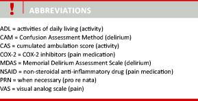 Only 28% of the patients were routinely assessed for delirium, using the Confusion Assessment Method (CAM), while 13% were assessed only when necessary. The Memorial Delirium Assessment Scale (MDAS) was rarely used. Delirium prevention by sleeping medication was initiated in 19%, whereas delirium treatment occurred in 40%, Table 3.