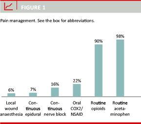 Only 28% (interregional range 2-51%) of the patients audited were assessed for pain on a visual analogue scale (VAS), Table 2. Most departments used opioids and acetaminophen postoperatively, Figure 1. Oral COX-2 inhibitors and nonsteroidal anti-inflammatory drugs (NSAIDs) were only used in 20%. The use of continuous epidural analgesia, peripheral nerve blocks and local wound anaesthesia was rare.
