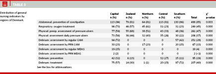 Data were calculated using SPSS version 17. Descriptive statistics were performed to illustrate the percentage of charts that documented treatment and care in each category. Data were analyzed according to the organizational regions of Denmark. Statistically significant interregional variations were calculated using χ 2 test, and p < 0.05 was considered significant.
