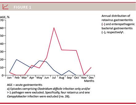 Conclusion: Rotavirus is the second-most frequently identified pathogen in adults hospitalised with AGE. Close contact to children or travel activity does not predict rotavirus gastroenteritis, but immunosuppression and a CRP below 50 mg/l do. The seasonality of rotavirus differs from that of bacterial gastroenteritis, making rotavirus the most frequently identified cause of AGE in adults admitted to hospital in the colder months.