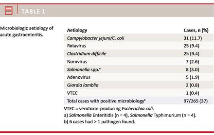 Faecal samples from 25 patients (9.4%) tested positive for rotavirus. Enteropathogenic bacteria were isolated from 65 patients (24.5%). The microbiological