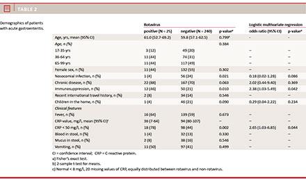 Table 2. Immunosuppression was a significant factor in being infected with rotavirus. Nosocomial infection, AGE with onset after ≥ 3 days of hospitalisation, was inversely associated with being infected with rotavirus. A significant part of rotavirus patients compared with non-rotavirus patients with AGE had a CRP under 50 mg/l (p = 0.002). In the multivariate analysis, patients with rotavirus were significantly more immunosuppressed than patients with bacterial pathogens (OR = 2.38; 95% CI: 1.03-5.49) and a CRP < 50 mg/l (OR = 2.65; 95% CI:1.03-6.85) was found more frequently.