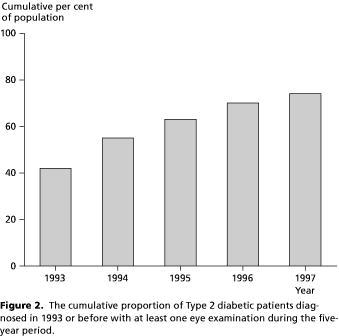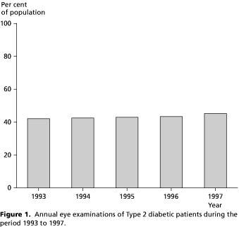 Methods: The type 2 diabetic population alive and resident in the County of Vejle on 1st January 1997. Data concerning eye examinations were collected from public data files for the period of January 1993 to December 1997.