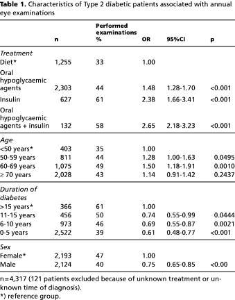 The patients with a long duration of diabetes, poor glycaemic regulation and who were being treated with insulin or oral hypoglycaemic agents were more likely to have had an eye examination. These predictors constitute risk factors for development and progression of diabetic retinopathy, and our results suggest that high-risk patients were more likely to have had an eye examination. This corresponds to the results of the Wisconsin Epidemiologic Study of Diabetic Retinopathy (12). But according to the guideline on care of type 2 diabetes, all diabetic patients and not only patients at high risk were recommended to receive an annual eye examination. It is noticed that males were more unlikely to have had an eye examination than women. This corresponds to the general pattern of males as less frequent attenders in the health care system (15). Furthermore, the probability of having an eye examination decreased after the age of 70 years.