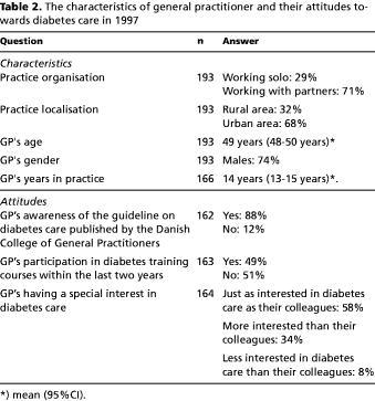 Data related to each GP was provided by the National Health Service Registry, ie age and gender, practice organisation, localisation, number of blood glucose measurements performed in general practice, number of patients listed in practice and the gender and age distribution of patients. All 215 GPs received a questionnaire concerning their attitudes towards diabetes care. This part of the study asked questions concerning the GP's acquaintance with the guideline on diabetes care published by the Danish College of General Practitioners (9), the GP's participation in diabetes training courses within the last two years and the GP's interest in diabetes care.