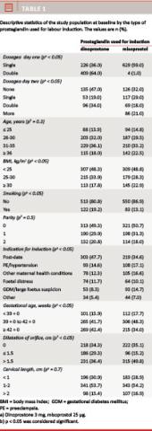 The misoprostol group had higher BMIs, fewer smokers and lower gestational ages than the dinoprostone group.