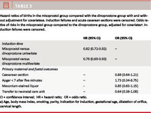The HR of birth was 0.82 (95% confidence interval (CI) 0.72-0.92), which indicated a reduced rate in the misoprostol groups compared to the dinoprostone group (Table 2). The misoprostol rate remained reduced after adjusting for covariates (HR = 0.79 (95% CI: 0.69-0.90)). The same differences between induction regimens were found when stratified by induction indication or by gestational age (Table 1).