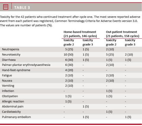 The severest reported adverse event from each patient was registered. The treatment was generally well tolerated with only nine patients (five in home-based and four in out-patient treatment) reporting grade 3 adverse events. There was a trend of more reported grade 2 toxicity in home-based treatment than in outpatient treatment. The most frequent adverse event was neurotoxicity which was managed by reduction or discontinuation of oxaliplatin. Other adverse events observed in more than 10% were neutropenia, diarrhoea, palmar-plantar erythrodysaesthesia and hand-food syndrome (Table 3)