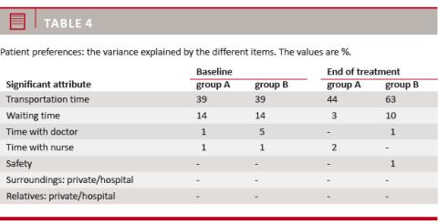 We found no significant difference between patient preferences in the two groups. The highest-ranking preference of the patients was transportation time, both at the start of treatment and at the end of treatment (Table 4)