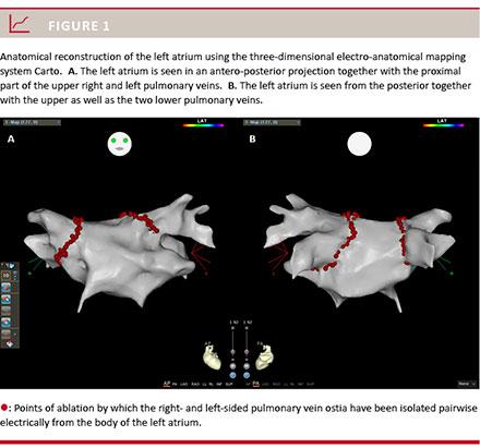 A three-dimensional map of the left atrium and pulmonary vein ostia was obtained using the Carto system (Biosense Webster, Diamond Bar, CA) (Figure 1). A circular mapping catheter was used to map the left atrium as well as to ensure pulmonary vein isolation (PVI). An irrigated mapping and ablation catheter, Thermocool ST or Thermocool SF (Biosense-Webster, Diamond Bar, CA), was used for radiofrequency ablation (RFA) with a maximum power of 35 W, except for the posterior wall where a maximum power of 25 W was routinely used to avoid collateral tissue damage. PVI was ensured by elimination of pulmonary vein potentials from the circular mapping catheter in an ostial position (entrance block) as well as loss of conduction of locally captured pacing impulses from the circular mapping catheter (exit block). At the discretion of the treating electrophysiologist, additional substrate modification was performed in some patients with persistent atrial fibrillation.
