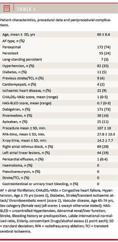 The authors (PSH) contacted all patients by mail and/or telephone and invited them to complete a standard questionnaire regarding late bleeding complications, thromboembolic events and adherence to medication three months after the ablation. A total of five patients (2.1%) neither answered the questionnaire nor responded to the phone calls. No particular characteristics in these five patients differed from the 98% of patients for whom follow-up was achieved.