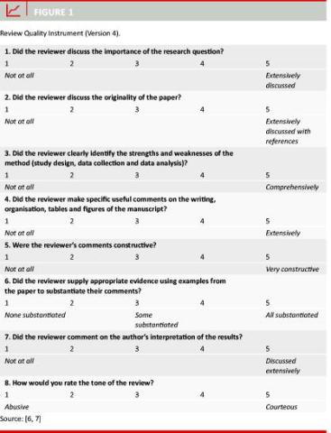van Rooyen S, Black N, Godlee F. Development of the Review Quality Instrument (RQI) for assessing peer reviews of manuscripts. J Clin Epidemiol 1999;52:625-9.