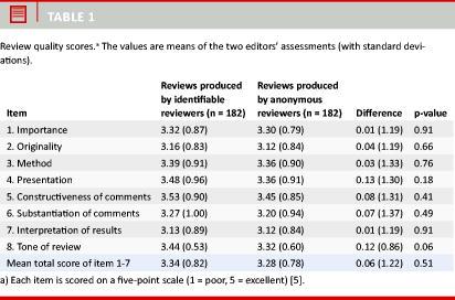 Quality scores (means) for each of the eight items are presented in Table 1. For each item, there was no statistically significant difference between the reviews produced by the identifiable reviewers and the reviews produced by the anonymous reviewers. Furthermore, as for the mean quality score (items 1-7), the difference between the two groups was statistically insignificant (3.34 versus 3.28, standard deviation of difference = 1.22, p = 0.51) (Table 1).