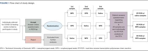 OPS is the standard collection method for SARS-CoV-2 testing specimens at public test centres in Denmark [4]. The saliva, OPS and NPS samples will be placed in separate tubes with universal transport media and sent to the laboratory of clinical microbiology at the Technical University of Denmark (DTU) for SARS-CoV-2 RT-PCR testing. The criteria for a positive RT-PCR test result will be a cycle threshold (Ct) value below 34. To minimise any bias in the sampling method, the order of the sample methods will be randomised by REDCap Software during participant enrolment (see Figure 1). The participants will be invited to complete a questionnaire to assess their pain or discomfort during the procedures. Furthermore, they will complete a questionnaire about their symptoms and the number of sick days. All data will be documented on-site in a secure web database (REDCap).